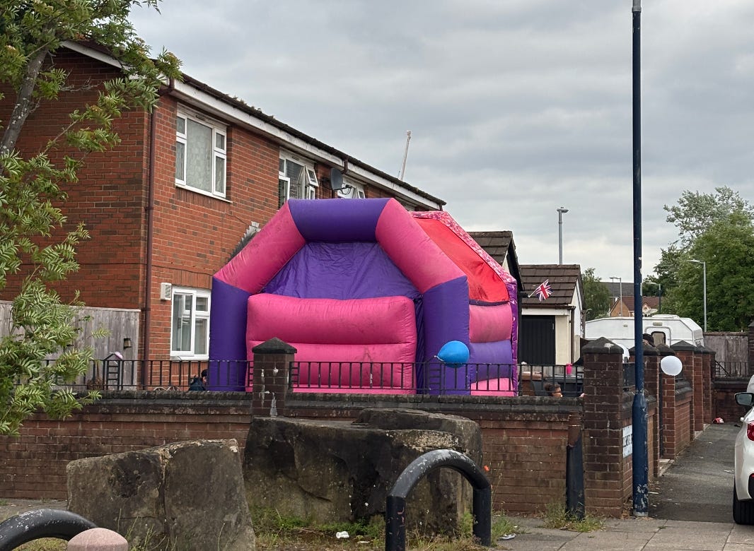 A bouncy castle near a church (church was on the left)
