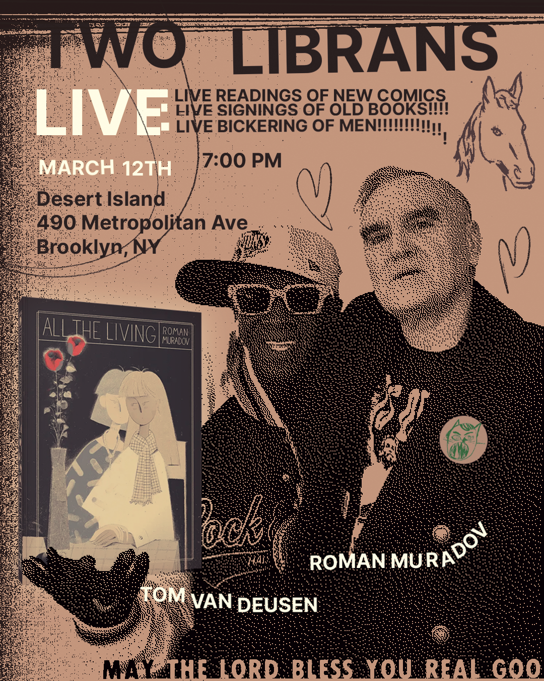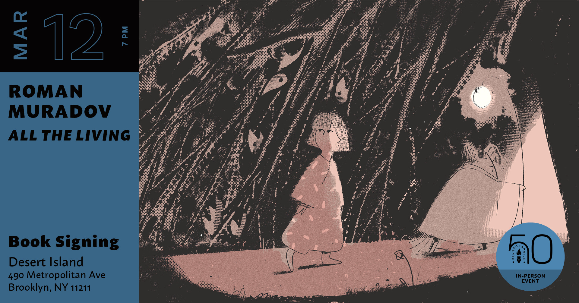 Roman has a new graphic novel coming out from Fantagraphics. He’s doing an event for it at Desert Island in Brooklyn, and Tom will join and read some new comics.